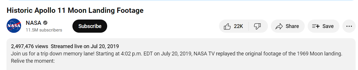 Here’s NASAs YouTube channel that boasts an astonishing 11.5 million suckers subscribers: