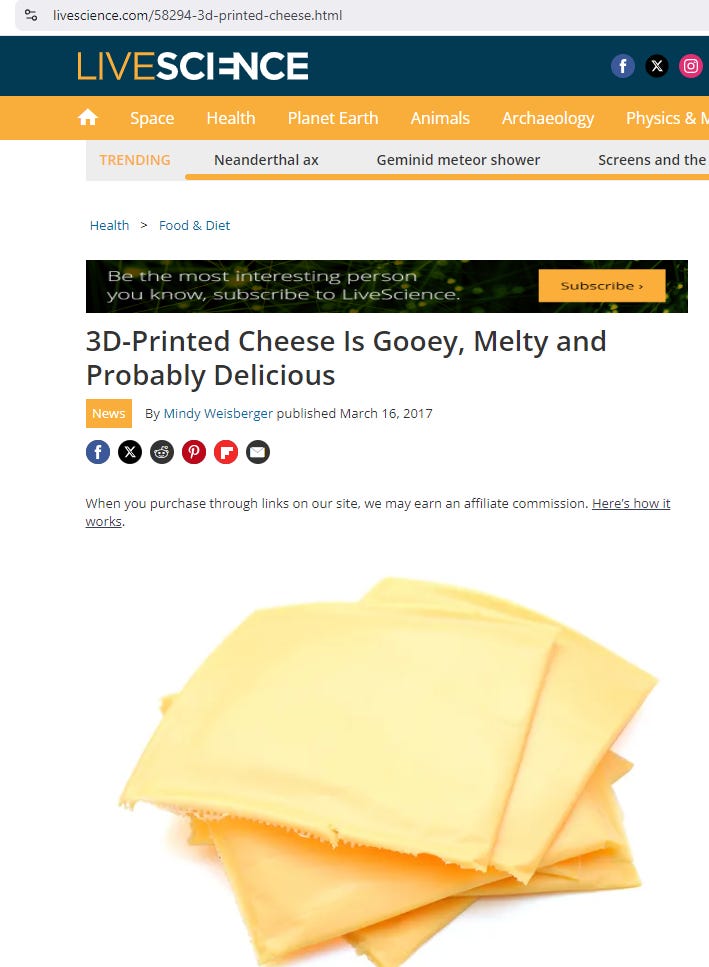 Yes, 3D printed food is real and yes, they want us to eat it but reality is, they needed to make us believe this crazy fake food isn’t already in the food supply - we needed to believe this was some far-in-the-future plan that we can collectively rebel against when the time comes, meanwhile, nonauthentic food is here and it’s been here. Want proof of the PSYOP? Look no further than this article: