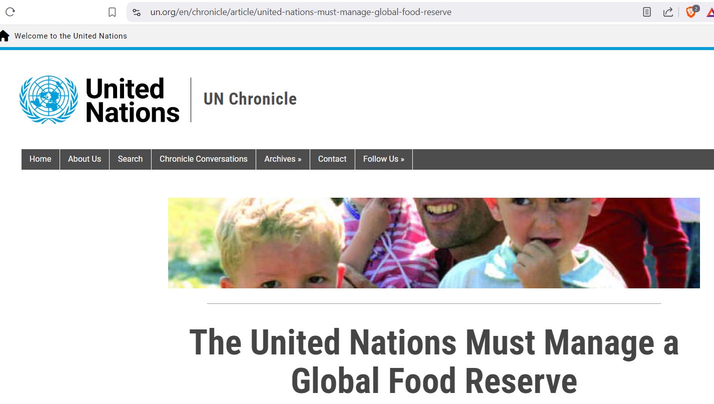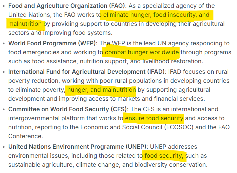 Factually, the United Nations is very involved with the food supply of the world, so involved that they have at least five different organizations that address the same issues - and you know it’s a quite serious issue when so many entities are paid to do the exact same work.