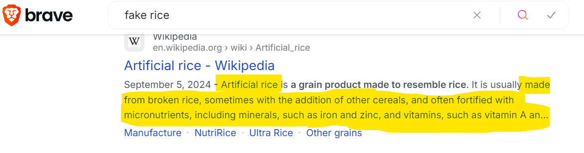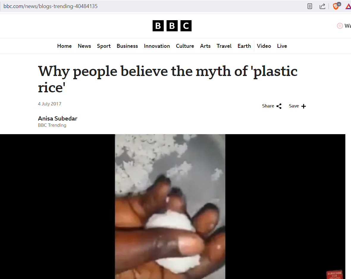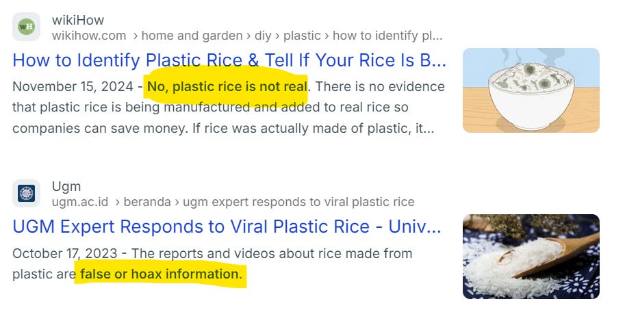 Of course if you Google “plastic rice” or “fake rice” the media will assure you there is no such thing: