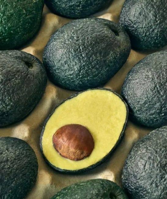 “Made with beeswax and natural food coloring containing spinach and charcoal powders, the Ecovado skin mimics avocado peel. The meat of the alternative fruit is made with four simple ingredients: broad beans as the base, apple for freshness, cold-pressed rapeseed oil for creaminess, and a sprinkle of hazelnut. A whole chestnut or hazelnut is used for the pit.” - but they assure us the Ecovado is not in the food supply yet and they’re not lying, this specific item called the Ecovado is not in the food supply yet because whatever is in the food supply and has been in the food supply is far worse: