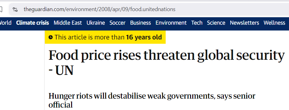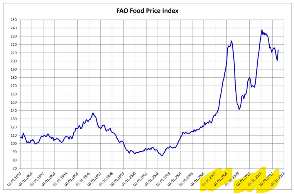 Magically, the same year, I mean the exact same f*cking year, was The 2008 Food Crisis in which prices on commodity foods suddenly skyrocketed: