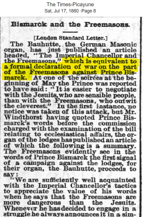 The same year, 1880, Bismarck attacked the Freemasons, stating they are even more dangerous than the Jesuits and went on to say, “It is easier to negotiate with the Jesuits, who are sensible people, than with the Freemasons, who out-wit the cleverest”. It appears the Prince was examining the Masonic Lodges and the Bills which allowed them to exist in effort to ban the lodges entirely. This led to the Freemasons declaring war on the Prince.