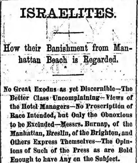 In America, specifically New York, there was a war on Jws. They had just been banished from numerous areas including railroads and beaches. Let’s check out an article from 1879 called Israelites, How their Banishment from Manhattan Beach is Regarded: