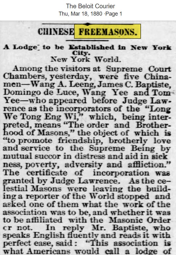 The same year the Chinese Freemasons established a Lodge in New York.