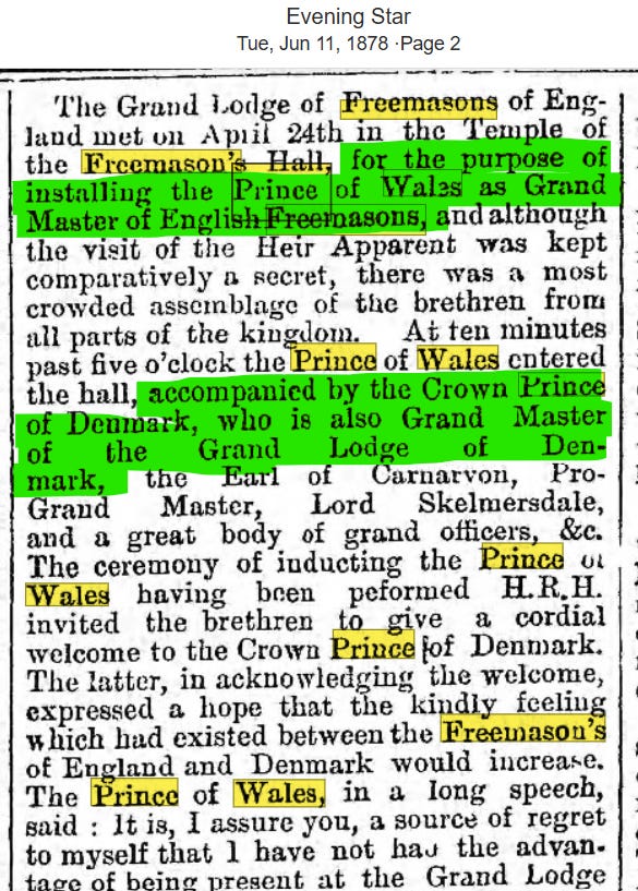 In 1878, there were two assassination attempts on Wilhelm I, the German Emperor who was known as the “Protector of Freemasons”. The same year the Prince of Wales was installed as Grand Master of English Freemasons and the Crown Prince of Denmark took over the Denmark Lodge. The Earl of Carnarvon (England) as well as Lord Skelmersdale (who I believe was in UK Parliament) were also members.