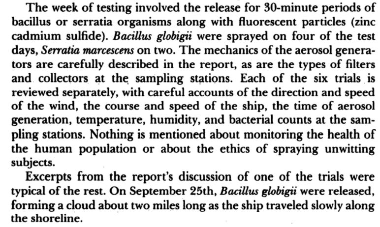 Developing pathogens included “open air biological warfare tests”, which meant pick a state and start spraying.