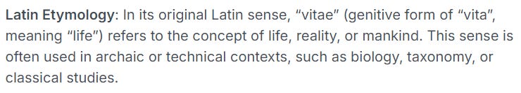 Vita comes from Vitae. The definition of Vitae “refers to the concept of life, reality, or mankind”: