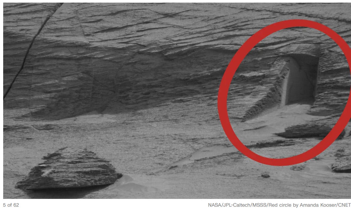 And when people look at those dusty, vacant, nothing images and find oddities, they are quickly called Conspiracy Theorists and an absolutely absurd explanation is given. For example, when people spotted a doorway on “Mars”:
