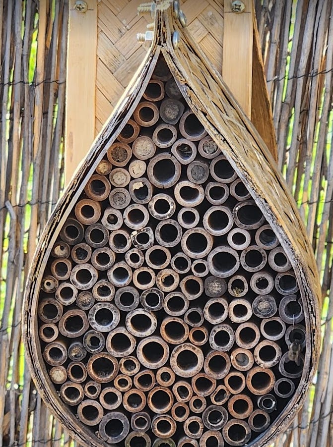 On April 11th, 2024, due to the high temps, I saw a dozen flies in the garden so I brought the sad bee houses back outside and put them on their garden hooks. It was so depressing. But to my complete shock, only a couple days later, I witnessed a miracle. On April 14th, 2024, a handful of bees began hatching!