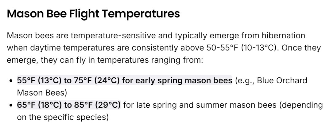 After only a week life, the temperature was plummeted down. Mason bees cannot fly when the temp is under 55 degrees. Because they can’t fly, they can’t eat and cannot reproduce. The temperature remained chilly just long enough to slaughter all of the bees. This was the first summer that I noticed the severe lack of pollinators as a whole. My brand new bee houses never got a single tenant. June 4th, 2023, still not a bee in sight: (18 second video)