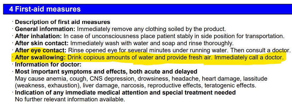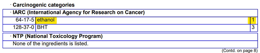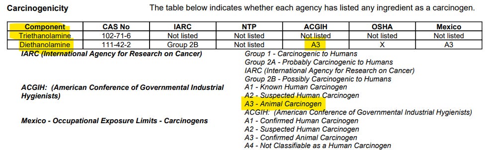 If you scroll down to page 5 of the MSDS, you learn the two chemicals that are used to make trimethylhydroquinone, and, here we see one of them is a known carcinogen to animals (because animals are who they test it on).