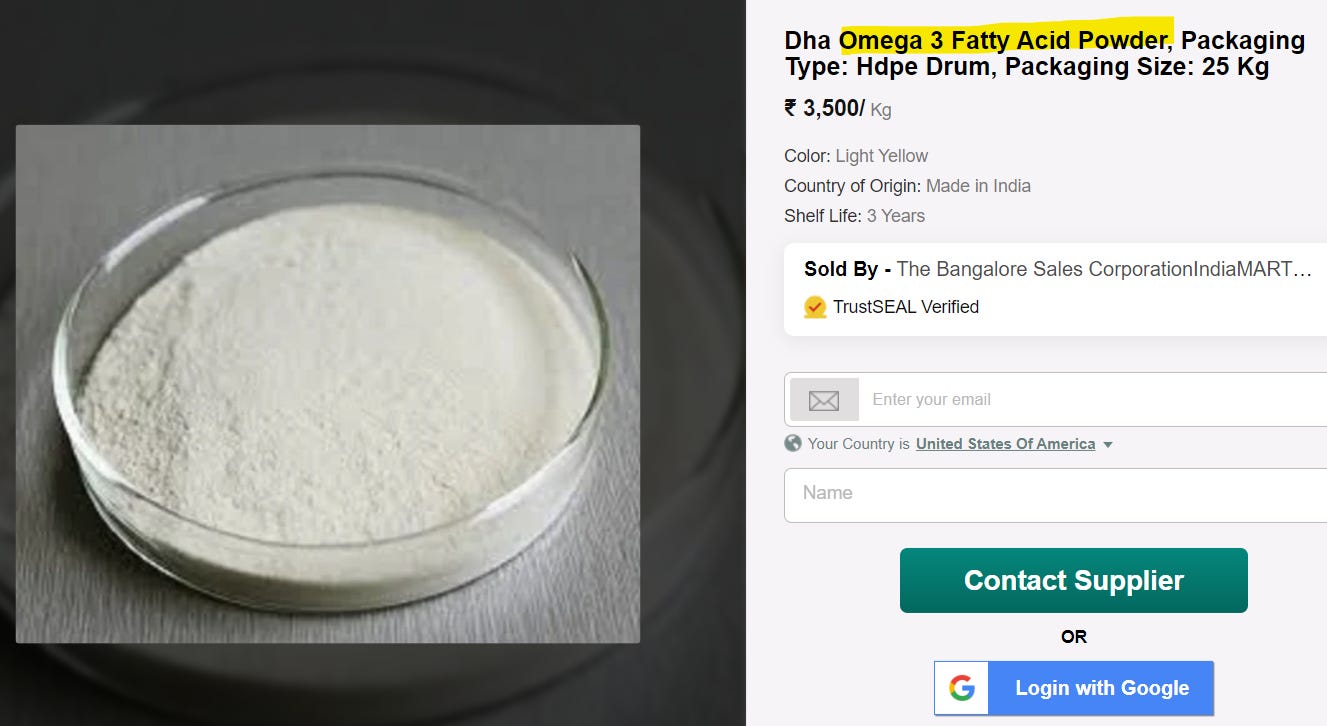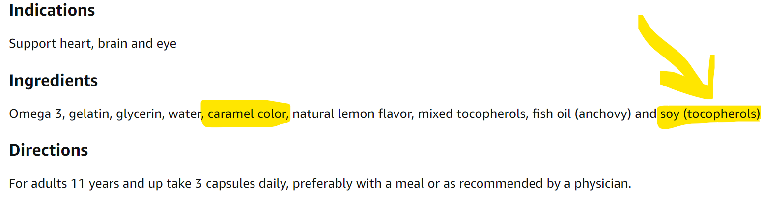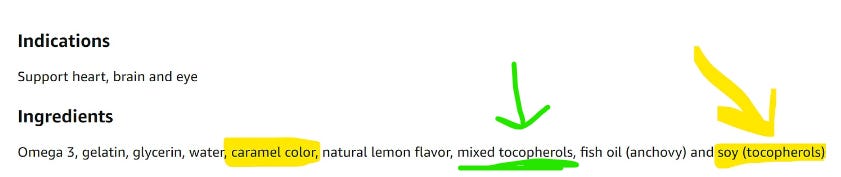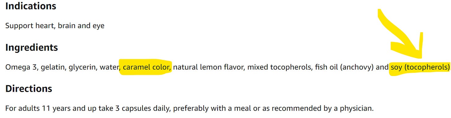 But if you scroll alllllllll the way down to the bottom of the listing, you discover it not only contains Soy but it also contains Caramel Color, which is a literal mega-poison, sold as a color additive. I might write about that rabbit hole soon. No joke, the other day I read that HONEY is an “allowed synonym” that can be used on the label in place of CARAMEL COLOR. HONEY CAN NOW MEAN A CARCINOGEN! But lets get back to looking at this $44 expensive AF bottle of hidden-ingredients Omega-3 supplement: