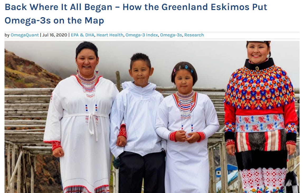 Last night, after I read the NIH sentence, but before I fell asleep, I was skimming through this heart-warming tale of the history of Omega’s and how “essential fatty acids” were discovered in Greenland Eskimos in the late 1970s.