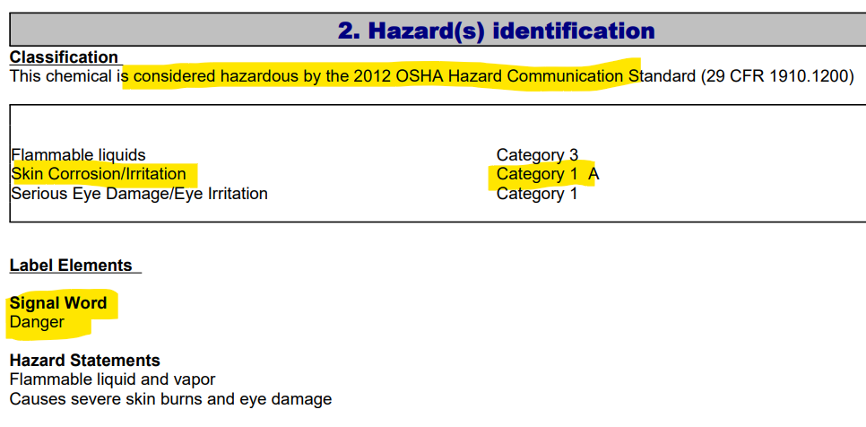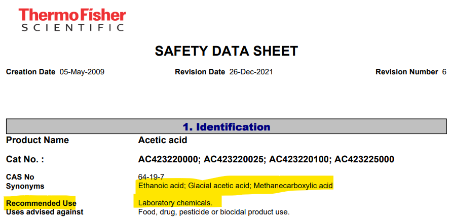 Here we notice, this is a chemical that should only be used in a laboratory, and is not to be used in food or drug. In addition to Acetic Acid, it has several different names: Ethanoic acid, Glacial acetic acid and Methanecarboxylic acid (so check your labels for those because:) We also learn it is hazardous. Not only is it hazardous, but it is a Category 1 hazard, which is the worst: