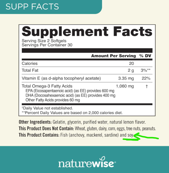 I see this one contains Fish Oil Concentrate. I’m not sure what that is yet. It looks like the Eicosapentaenoic Acid (EPA) and Docosahexaenoic Acid (DHA) are part of the fish oil concentrate, but those two combined only account for 600mg out of the 2,000mg of fish concentrate, so we have 1,400mg of something that has not yet been accounted for. Oh! Lookie here, it also contains soy, which they claim is what provides d-alpha Tocopherol. Is that soy oil that accounts for the missing 1,400mg? IF it is, this product is primarily Soy.