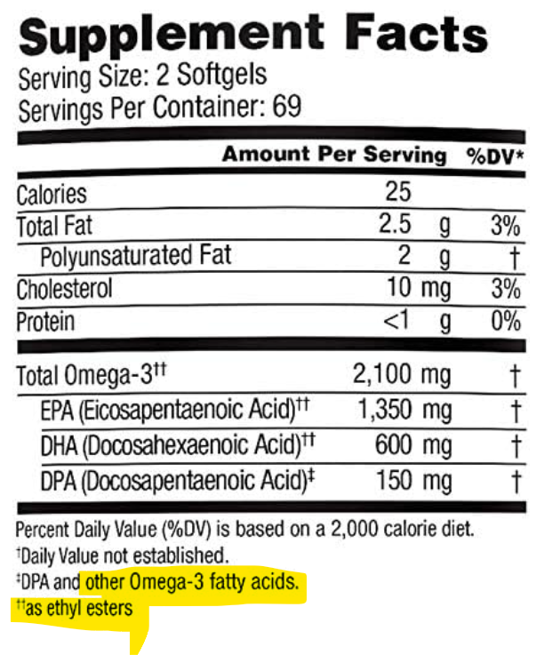 Despite the word “Professional” in their company name, this ingredient label is super sketchy. It has a little disclaimer that says “and other Omega-3 fatty acids” but doesn’t list what they are, so I’m assuming soy… and more? It also says the Omega-3s are coming from Ethyl Esters. WTF is an Ethyl Ester?