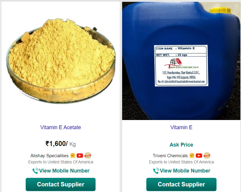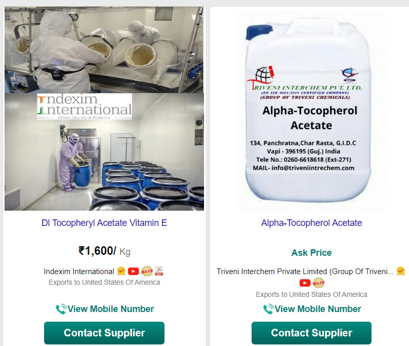 I looked up d-alpha acetate, also known as Vitamin E. Here it is on IndiaMart, sold by the same chemical manufacturers that make Vitamins D, B and C. It’s available in powder and liquid: