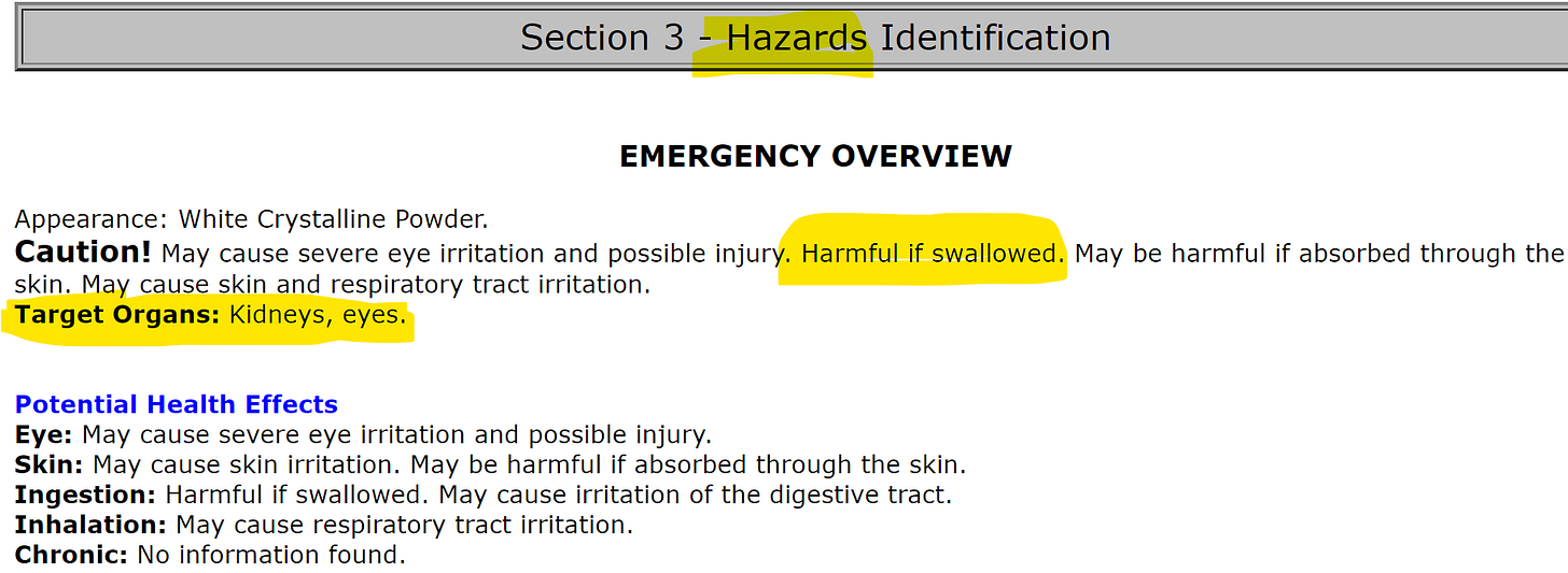 I pulled up the Manufacturers Safety Data Sheet for Acetic Acid. A Manufacturers Safety Data Sheet (“MSDS”) is a legal document that lists information relating to occupational safety and health for the chemical. It also provides important info, such as what it shouldn’t be used for, what it shouldn’t be mixed with, environmental hazard categories and more. So if you ever want to know exactly what you are consuming, you must look at the safety data sheet. I provided detailed instructions showing how to access MSDS in my B12 article. Here’s the MSDS for Acetic Acid: