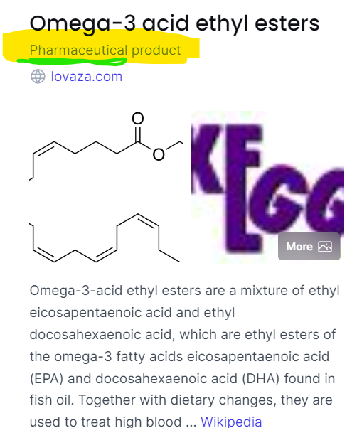 Take a peek at this bull-spit, “Omega-3 Acid Ethyl Esters” are a pharmaceutical product:
