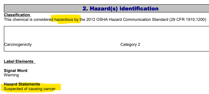Here’s the manufacturers safety data sheet. It’s hazardous because it’s suspected of causing cancer: