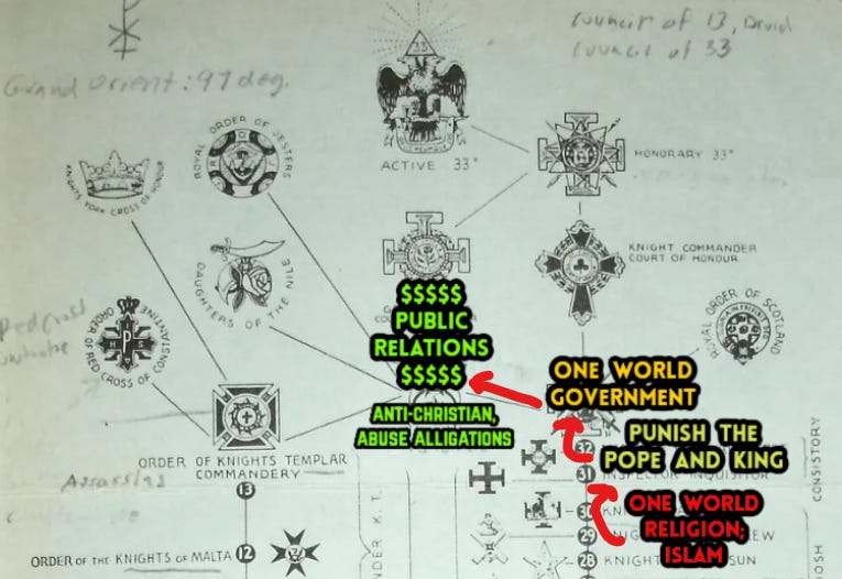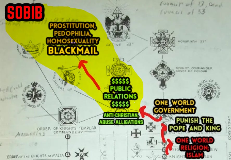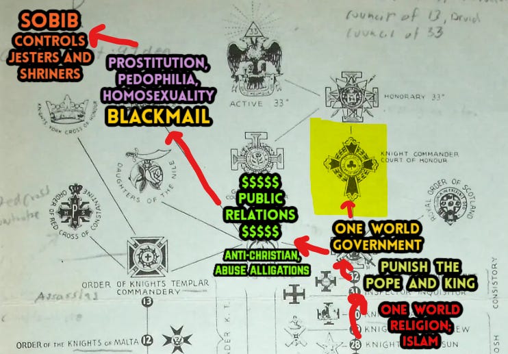With that being said, I don’t know if these two things have any relation and I don’t know if the 2008 book is legit, but in my opinion, a book of that nature would have been imperative because the men in it are from all over the world, as far as Australia. A catalog of members would ensure someone can’t infiltrate the group by pretending to be a SOBIB brother. This is the one and only catalog to ever leak, so this system had worked flawlessly until this point. We do know the organization itself is real because of the testimony of Sandy Frost (author of Vampires of Charity) and other victims of the Shriners/ Jesters / SOBIB (discussed in part 3). Let’s throw my findings on the chart and change directions, this time going up to the 33rd Degree Knight Commander Court of Honor: