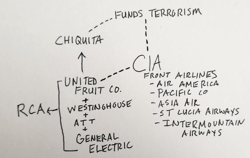NBC took over News Vine and wiped clean the content they didn’t approve of. Now you can only read the web captured version of her article using this link - and don’t forget who NBC is! I outlined how they came to be in my series on Evergreen Airlines, Part 2, Connecting the Dots: United Fruit, the CIA, Terrorism & the Firefighting Planes that Don't Fight Fires (flowchart from article, yes, that is indeed Chiquita banana:)