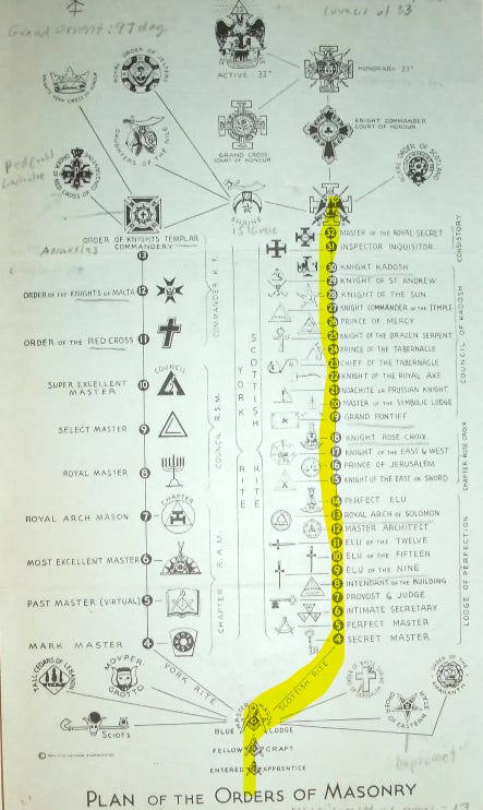 Here is the Freemasonic organizational chart showing degrees. In order to become a 32nd Degree Mason you have to start at the bottom and work your way up: