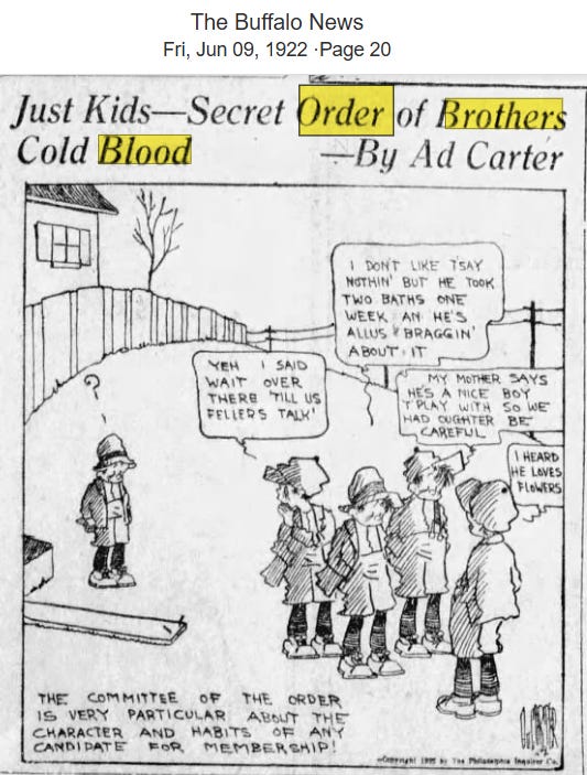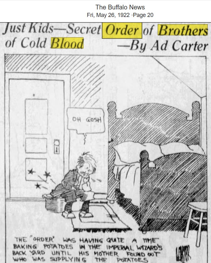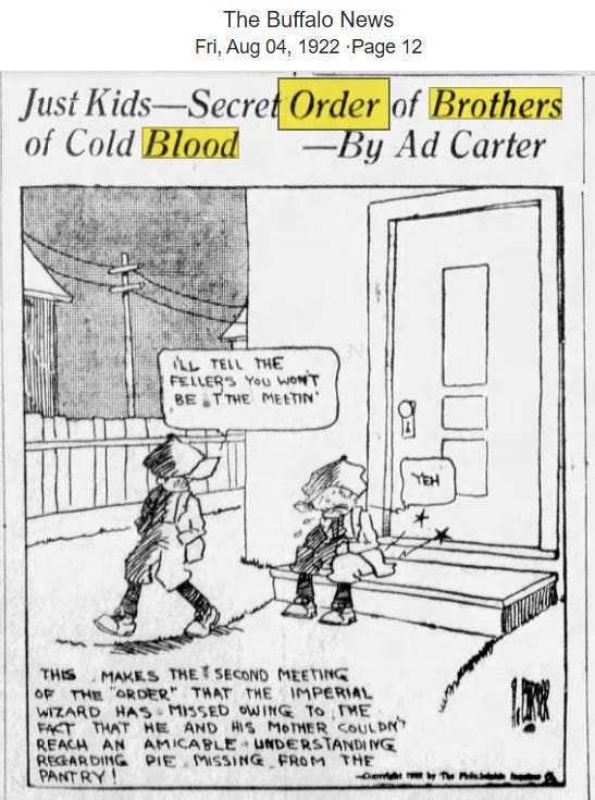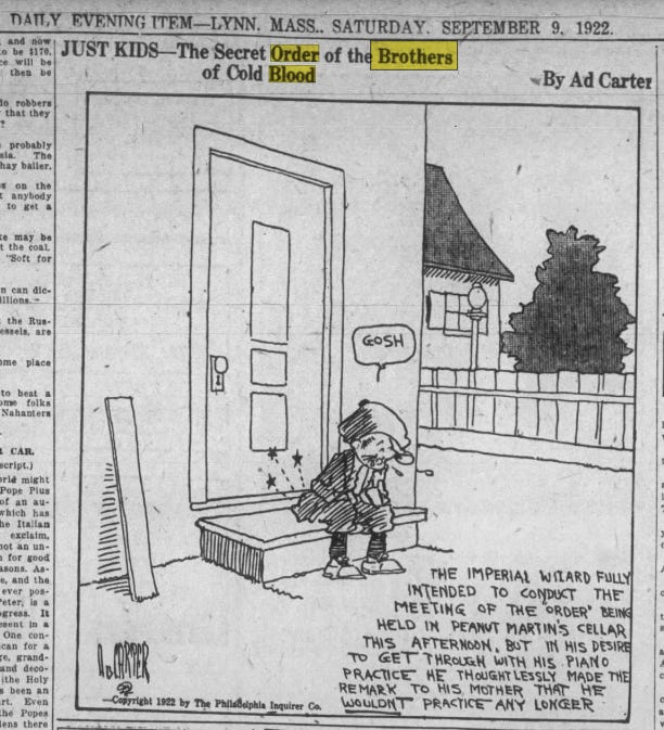 The next thing I found in newspaper archives is incredibly bizarre - a comic strip from 1922 called “Just Kids - Secret Order of Brothers Cold Blood”. It appears to blend Freemasonry and the KKK: