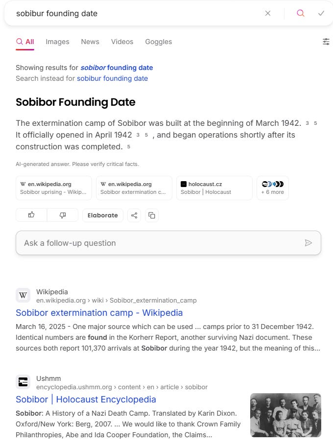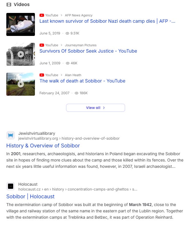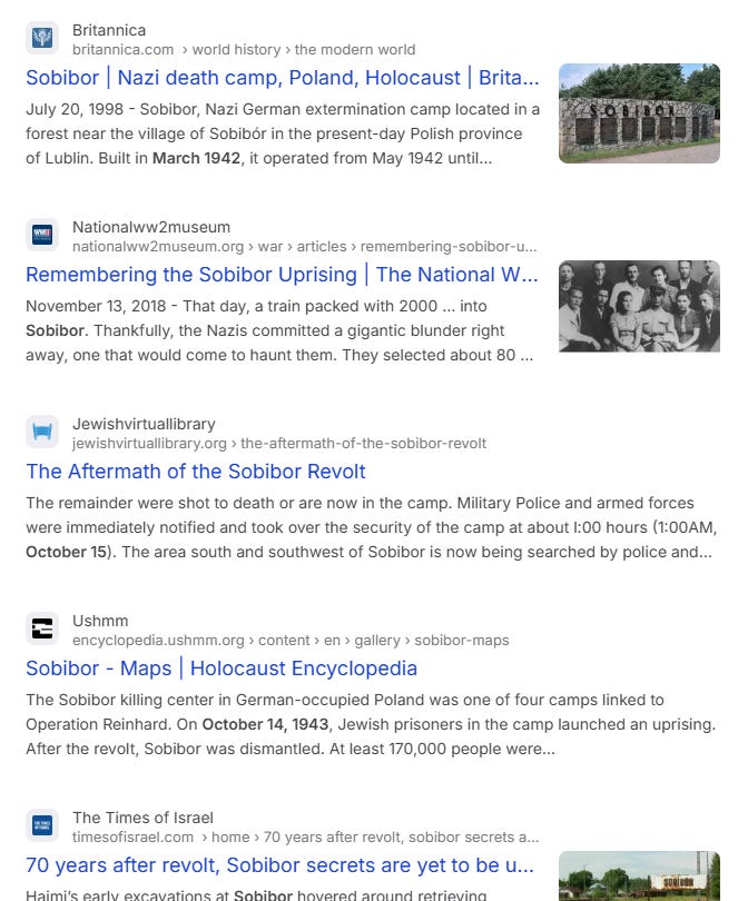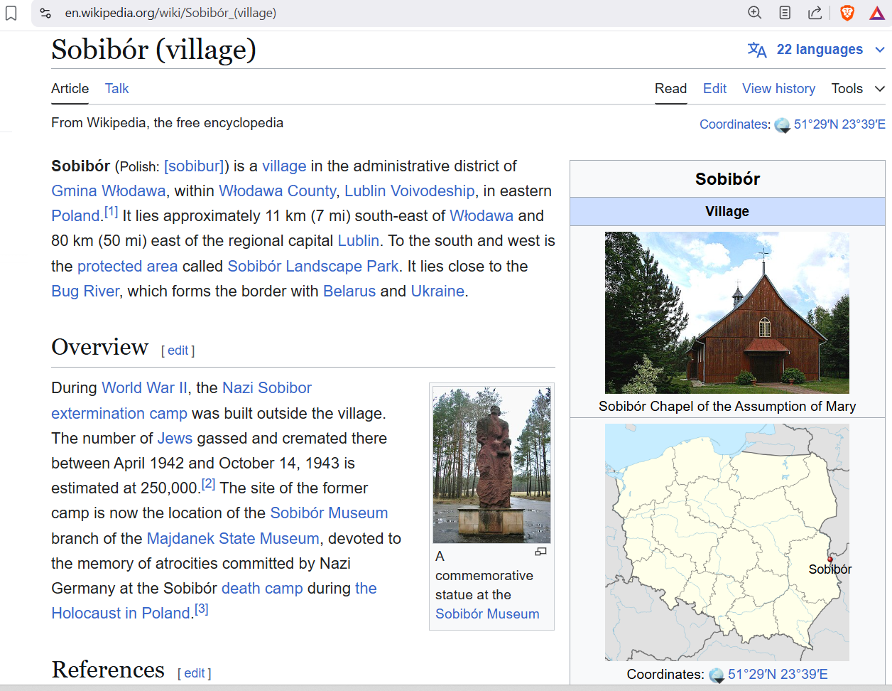 I ran a variety of internet searches like “date Sobibór Village Established”, “History of Sobibór Village”, etc, and got nothing. Even if you change the spelling to the Polish spelling, Sobibur, your spelling is corrected and you are redirected back to the same content: