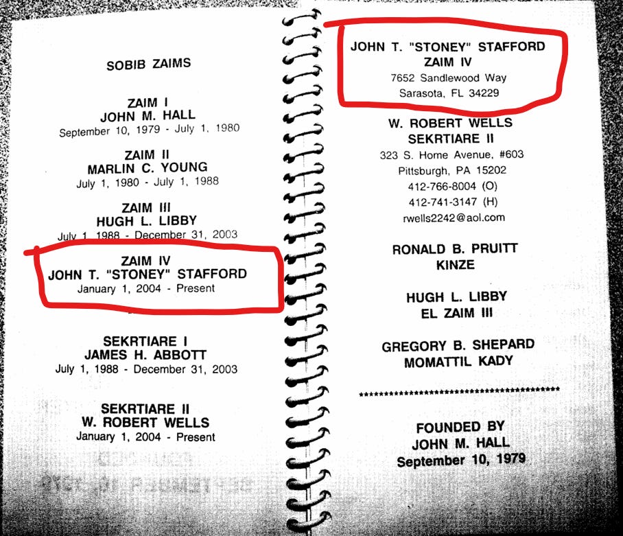In the SOBIB directory, John T "Stoney" Stafford was listed as the 4th and current "Zaim" of the Sovereign Order of Brothers in Blood: