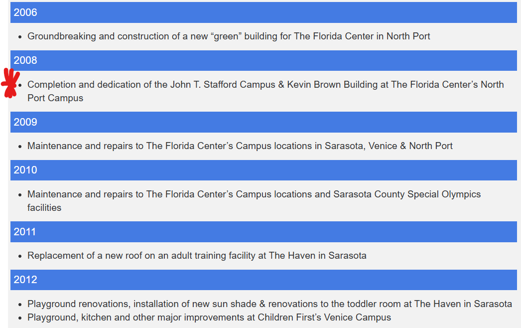 Mr. Stafford, other than being the Zaim, was the head of Suncoast Bank until it sold. This dude was such a huge deal to the Masons that in 2008 (the same year as the directory) a building was dedicated to him too, the John T. Stafford Campus & Kevin Brown Building at The Florida Center’s North Port Campus: