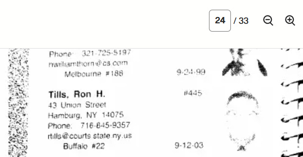 Let’s get back to SOBIB: Remember how, in my last article I wrote about Jesters member Ronald H. Tills, who was elected to the New York State Assembly in 1968 and was a judge on New York’s Supreme Court? He was also one of the dudes busted in the Freemasonic human trafficking ring. Well, this guy was not only a member of the Jesters, he was also a member of the top secret SOBIB and can be found on page 24 of the directory. He even used his government email address, rtills@courts.state.ny.us!: