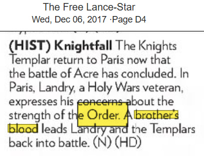 What I discovered in news archives ranged from basically nothing to “hmmm… interesting”. I ran a keyword search for “Order of the Brothers in Blood” and it pulled up a TV Guide listing from 2017 for the History Channels “Knightfall” about, of all things, the Knights Templar:
