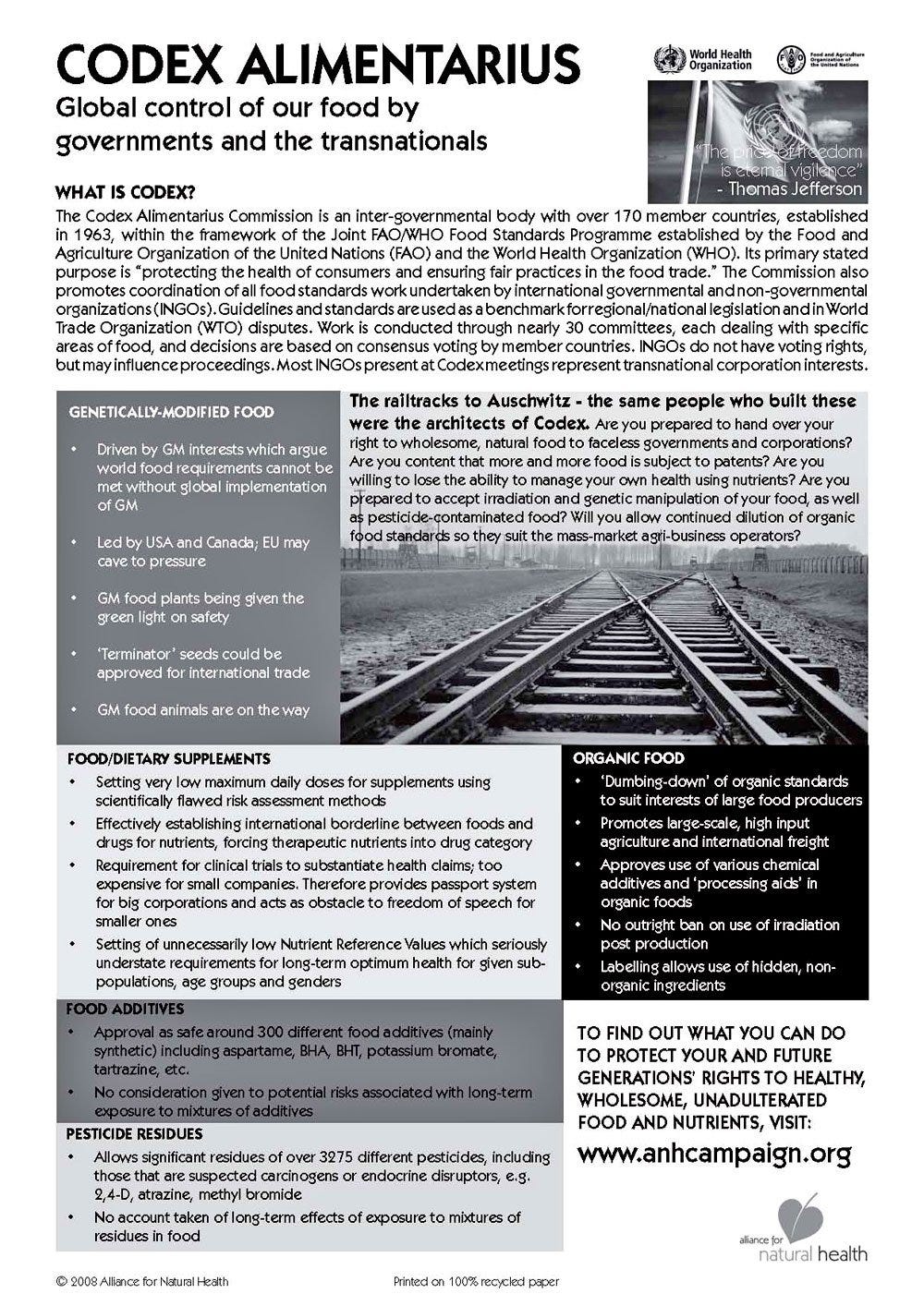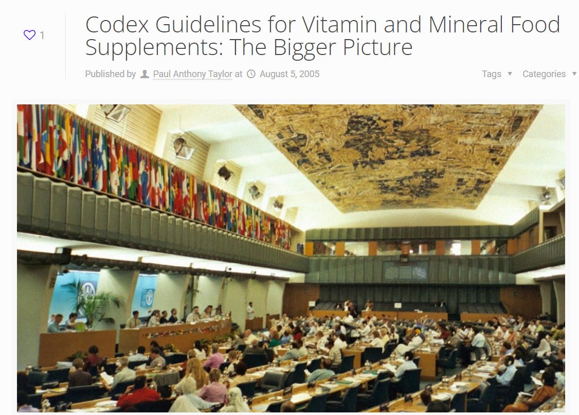 This document begins by explaining the decisions in the paper were made by the “Codex Alimentarius”. If you are not familiar, Codex Alimentarius was founded in the deepest pits of hell was created in 1962 by two United Nations organizations, the Food and Agriculture Organization (FAO) and the World Health Organization (WHO). Codex is located in Geneva, Switzerland. From their neutral country (they can’t be attacked, which is why all awful things, like CERN, banking transactions and evil meetings are there), they oversee all "food standards". When I say all, I mean ALL. Codex is who approves various chemical agents to be added to food, including which poisons are acceptable for organic food. And, I finally realized… CODEX IS WHO OVERSEES VITAMIN SUPPLEMENTS.
