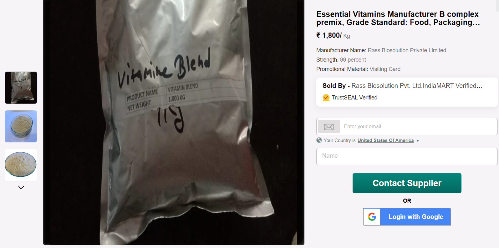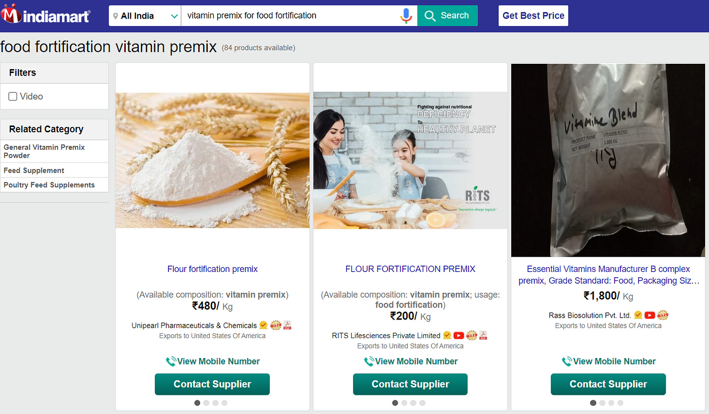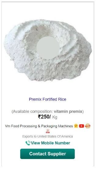 I wanted to find a bag of those chemicals for sale so I could peep all of the ingredients for us, so I did exactly what I did for the Vitamin D is Rat Poison, Vitamin B is Cyanide, Vitamin C is Corn Syrup and Mold and Omega-3’s are Soy and Carcinogens investigation, I went to IndiaMart.com. IndiaMart is like an eBay for bulk chemical manufacturers and buyers. I ran a search for “Vitamin Premix for Food Fortification”