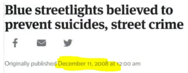 If you dig through internet archives, you will discover that this is not a new idea. Here’s an article from 2008 that claimed blue street lights reduce crime and prevent suicide.