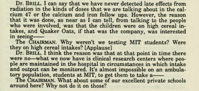 Not so fast. MITs findings-of-nothing didn’t stop Congress from asking MIT some really legitimate questions during the Senate Committee hearing Human Subject Research (AKA: Those Radiation Experiments).