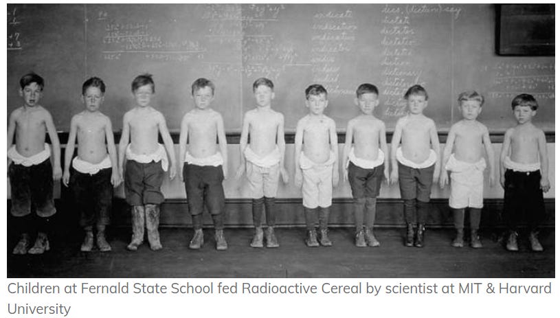 MIT: Massachusetts Institute of Technology seems to be involved in damn near every evil experiment I research, seriously though, it seems to always be Gates, DOW, Monsanto, the government and MIT (but mostly the government). This wicked study was no exception. When MIT was asked to participate in discovering how the human body absorbs minerals and vitamins, they orgasmed then eagerly accepted. After the grants from the NIH and the Washington-hating-AEC were secured, MIT developed a game plan, which consisted of recruiting children from Fernald School and secretly lacing their breakfast cereal with radioactive material. “There is absolutely no ground for caution regarding the quantities of radioactive substances which we would use in our experiments", wrote the lead MIT biochemist in a totally WTF letter sent to Fernald. Then, ideally, after the child had consumed the deadly cereal, a blood sample would be taken, in hopes of proving that the freshly-drawn blood was contaminated with radioactive elements, thus proving that whatever is in the cereal will make it into the bloodstream. You see, if they could show that radioactive material spread throughout the body, then they could claim that whatever good-shit was in the cereal would also spread.