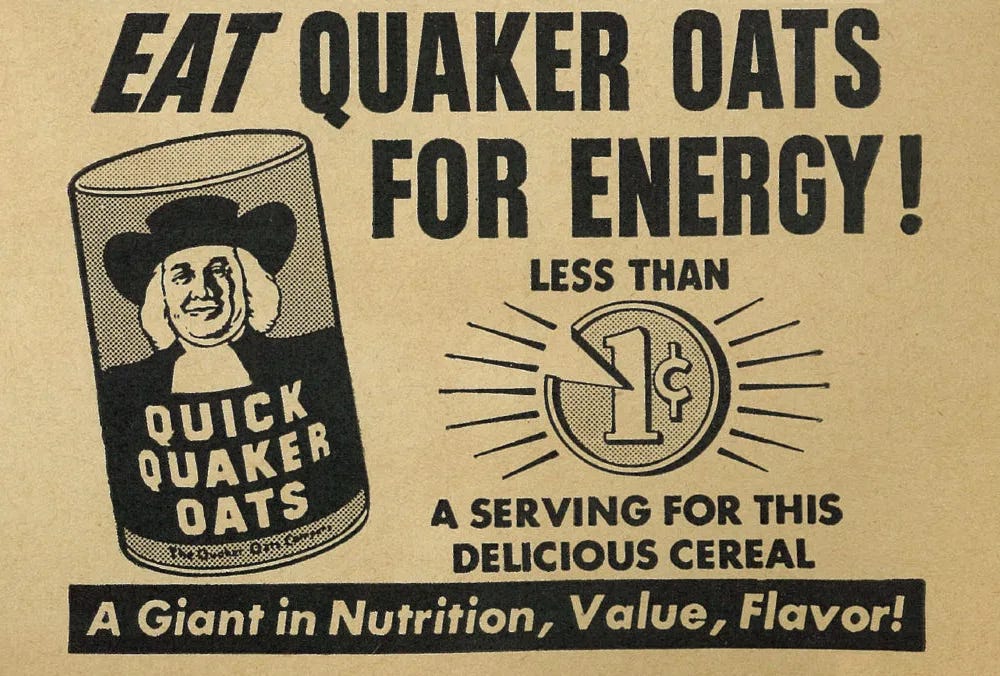 QUAKER OATS: In the late 1940s, Quaker Oats and Cream of Wheat were competing for top-dog position in the warm and squishy breakfast cereal industry. Quaker was sending single-serving samples to every home and focused on being a bigot making their niche white mothers: