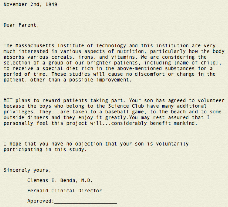 FERNALD SCHOOL: Word on the streets was that the school had a reputation for being happy to help with scientific research by loaning out its pupils. When they received word of this new study, they immediately sent out Permission Slips. The Permission Slips explained that MIT, a very well-respected, famous school, was conducting an exciting study in nutrition. It went on to say, the child was being selected because he was, “one of the brighter” children and that he would receive a “special diet rich in irons and vitamins”.