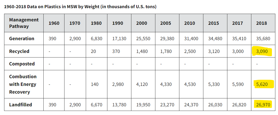 Although recycling plastic is still heavily pushed on us, often by the government, the government is well aware that it isn’t being recycled. Here’s a 2018 post on EPA.gov that shows that under 10% is actually being recycled; the vast majority goes to the landfill: