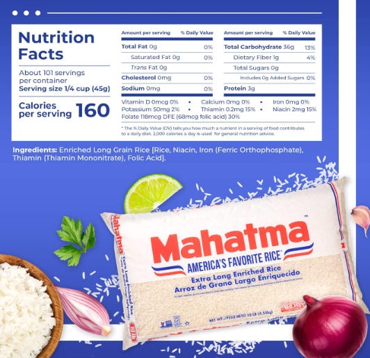 I wondered how much rice contains these ingredients, so I poked around Amazon for top-selling products. One of the best sellers is Mahatma Extra Long Grain white rice, which has basically the same ingredients: