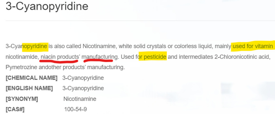 If you would like to learn more about 3-Cyanopyridine (one of the two starting ingredients to make Niacin), here’s the safety data sheet. You should send it to your favorite famous doctor who is peddling supplements containing niacin, then read their response, which will say the amount is so small it can't hurt you, to which you should reply, "…but it's pesticide…" then ask them if all insecticides are beneficial to human health or just this one.