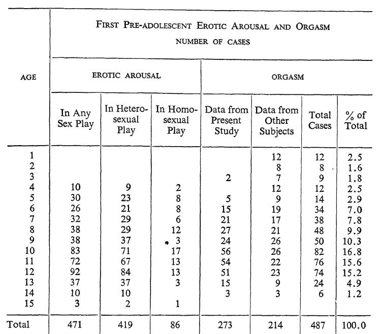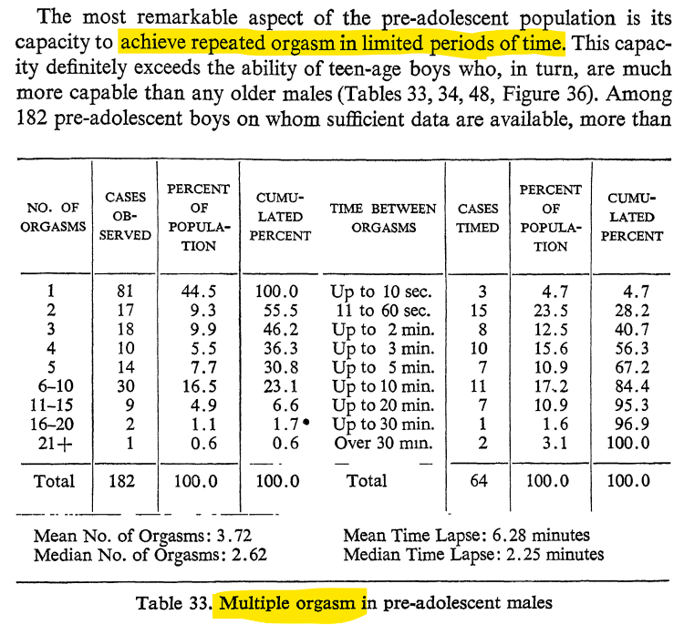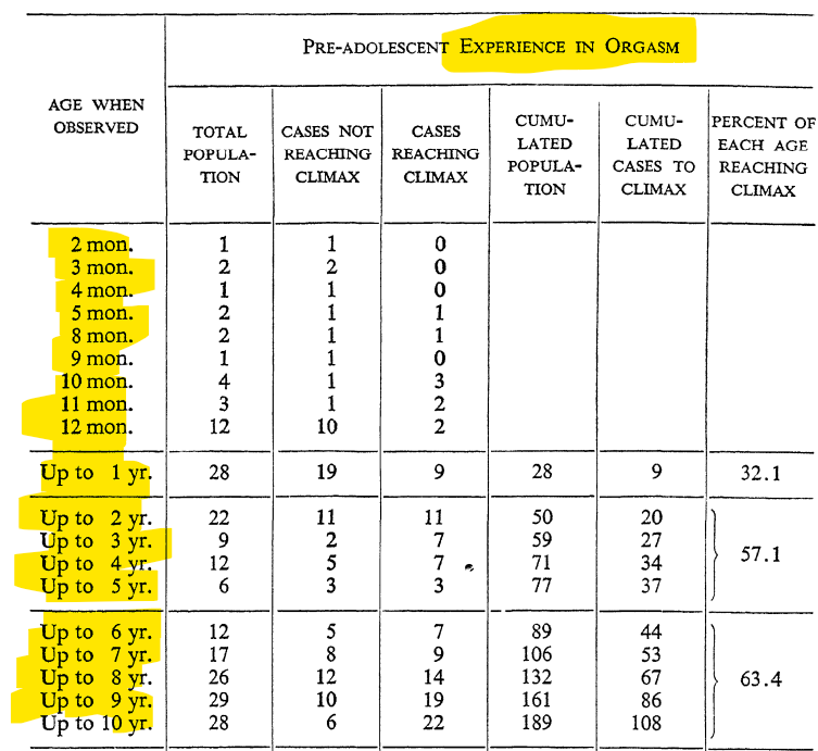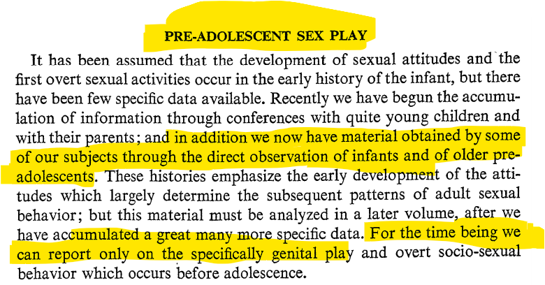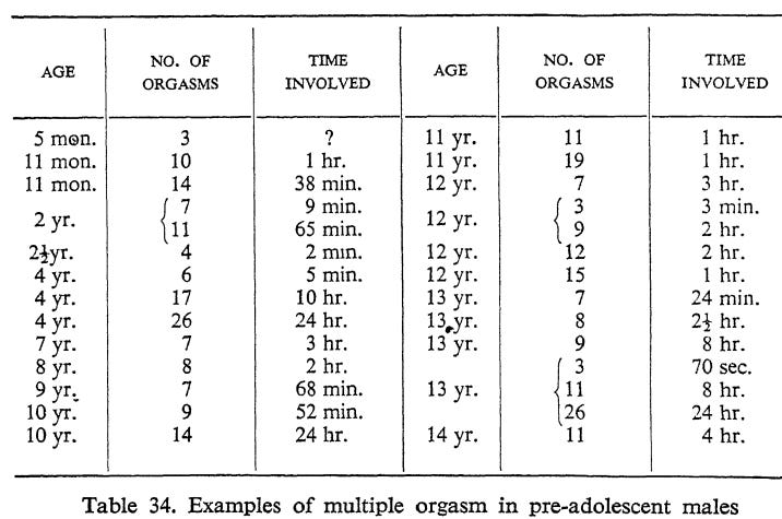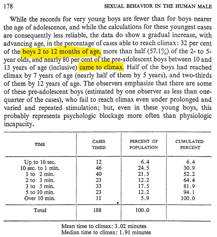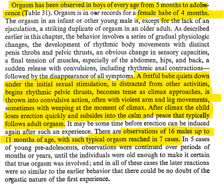 In the section titled “PRE-ADOLESCENT SEX PLAY”, Kinsey’s Book examines orgasms in children, specifically males. While he states the information was gathered from “conferences with quite young children” with their parents present, he also mentions having “material obtained by some of our subjects through direct observation of infants and of older pre-adolescents”.