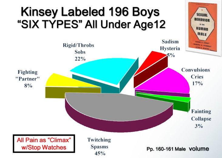 Unbelievably, he outlined in detail the orgasms experienced by babies as young as 4 months. Force yourself to read it and while you do, remember Wikipedia refers to this as “controversial studies” not child abuse, molestation or pedophilia: