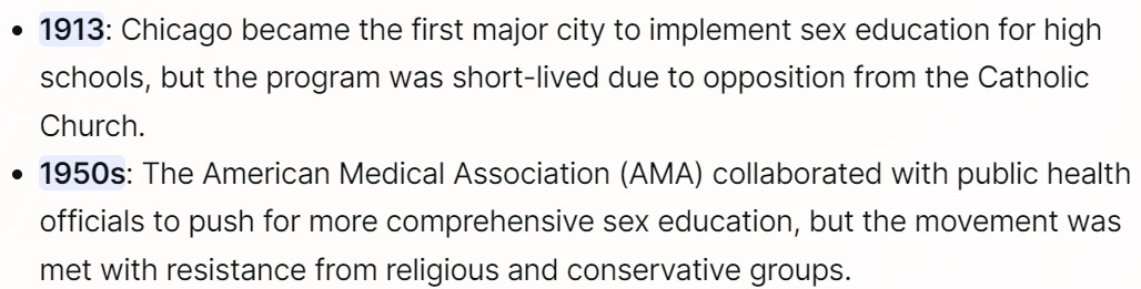 Prior to the 1960s, many organizations, including the American Medical Association had attempted to put Sex Ed into schools but Christians and Conservatives quickly overpowered the programs and the classes were promptly removed due to the general populous being outraged.