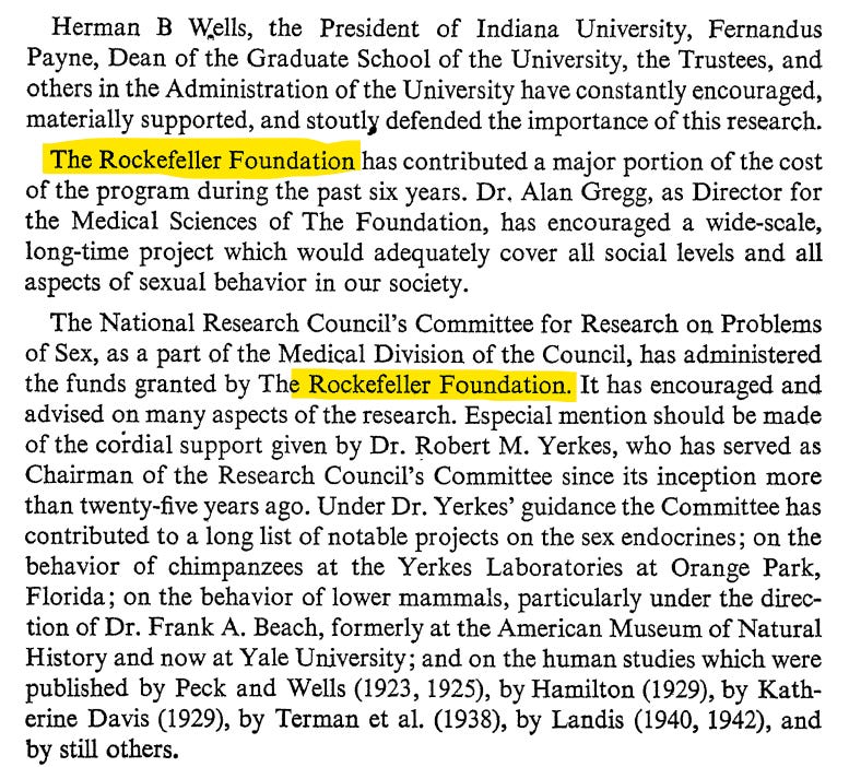 Believe it or not, Mr. Kinsey detailed his pedophilic crimes against children in a book which was published for public consumption. The book is called Sexual Behavior in the Human Male, written by Alfred Kinsey, himself. In the preface, Mr. Kinsey profusely thanks The Rockefeller Foundation for contributing “a major portion of the cost of the program during the past six years”: