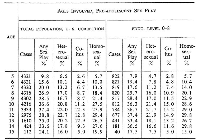 Here Kinsey claims that over 16% of the entire United States population of five-year-olds are involved in a “pre-adolescent sexual experience”:
