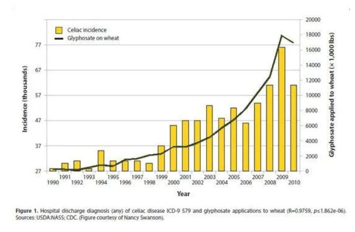 It is of no surprise that Gluten Allergies became mainstream shortly after farms started spraying wheat with Glyphosate (and Trade Secret). In the chart below the black line represents Glyphosate Herbicide used on Wheat. The yellow bars show incidences of Gluten Allergies, AKA “Celiac Disease”. (The word Disease implies it’s your fault, your genetics fault or just a really unfortunate situation and because it’s your fault you can’t sue a chemical company.)
